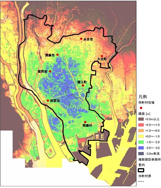 日光川流域では昭和34年の伊勢湾台風以降、大雨によりたびたび災害が発生しております。また、海部地域の広い範囲は大潮時の平均満潮位(標高+1.2m)より低く、海岸や河川の堤防が機能しない場合、海の満潮時には水に浸かる危険性があります。