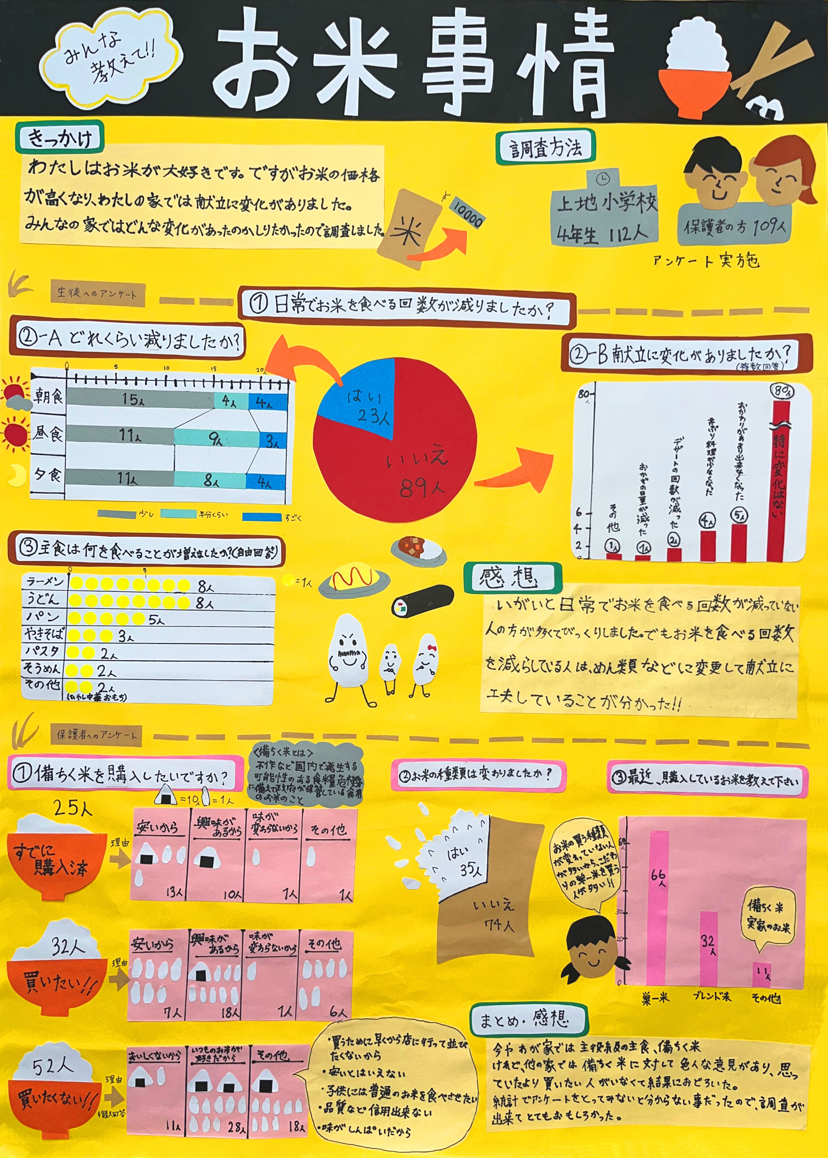 | 作者からひとこと | 大好きなお米の値段が高くなり、我が家の献立に変化がありましたが、皆の家はどうなのか気になり、調査しました。結果、他の家ではあまり献立に変化がなかったことにびっくり!!意外な結果でおもしろかったです。 | |