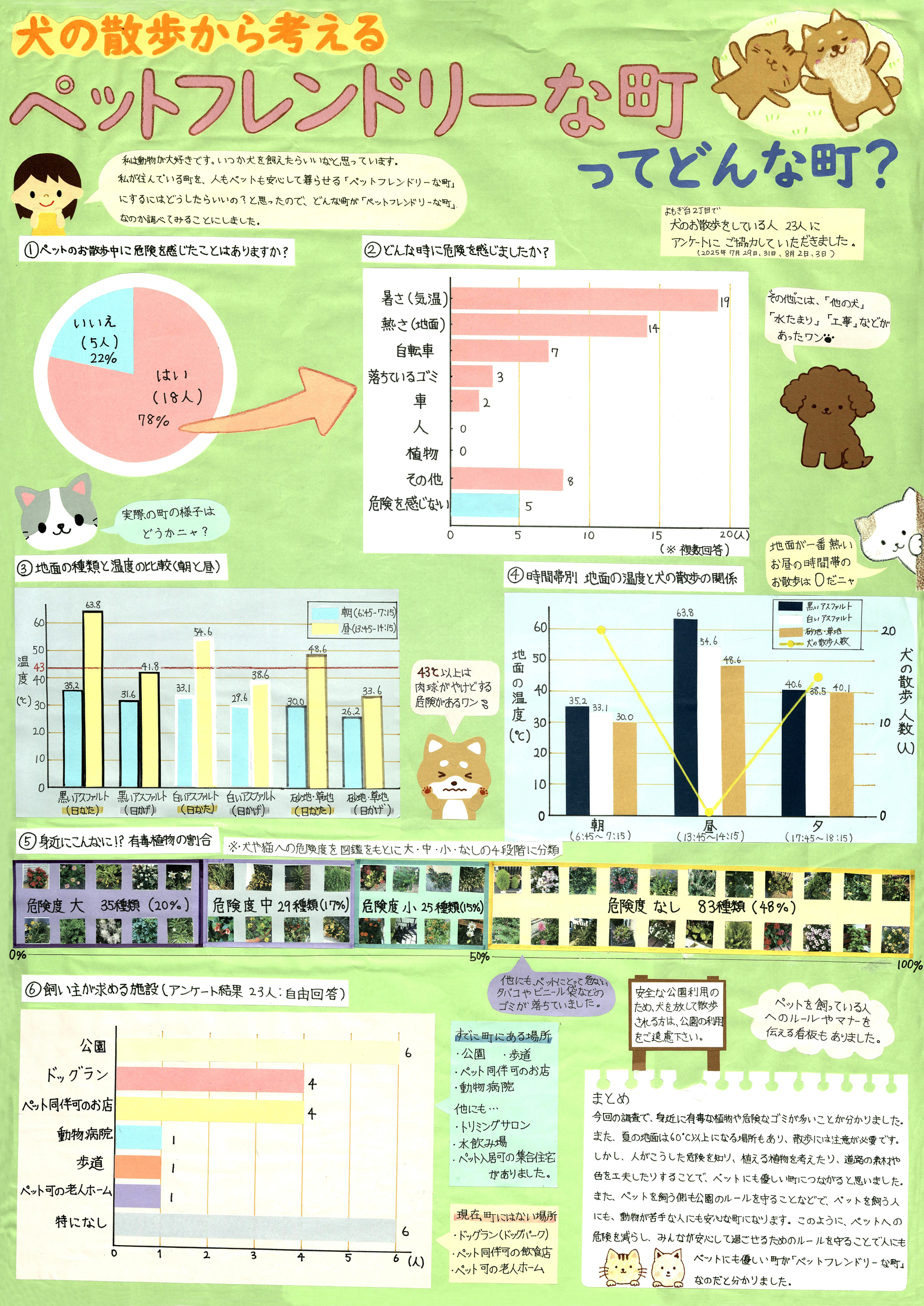 人も動物も安心して暮らせる「ペットフレンドリーな町」はどんな町か調査をしました。動物への危険を減らし、みんなが安心して暮らせるためのルールを守ることで、ペットフレンドリーな町にしていけると思いました。 |