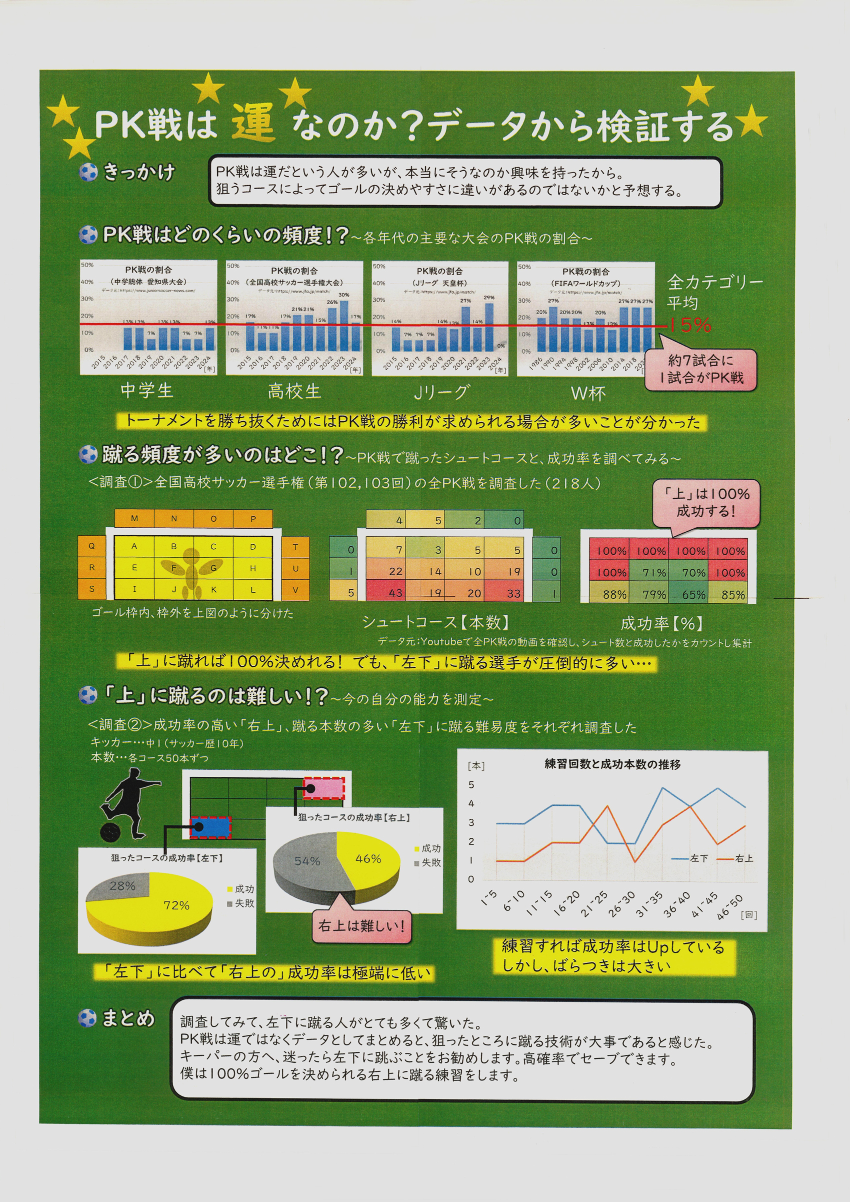 | 講評 | 練習回数と成功本数の関係を自分で調べ、実際に試してグラフにまとめている点が良いと思います。狙うコースごとの成功率を分析し、パソコンを効果的に使って視覚的な工夫も見られます。 | |