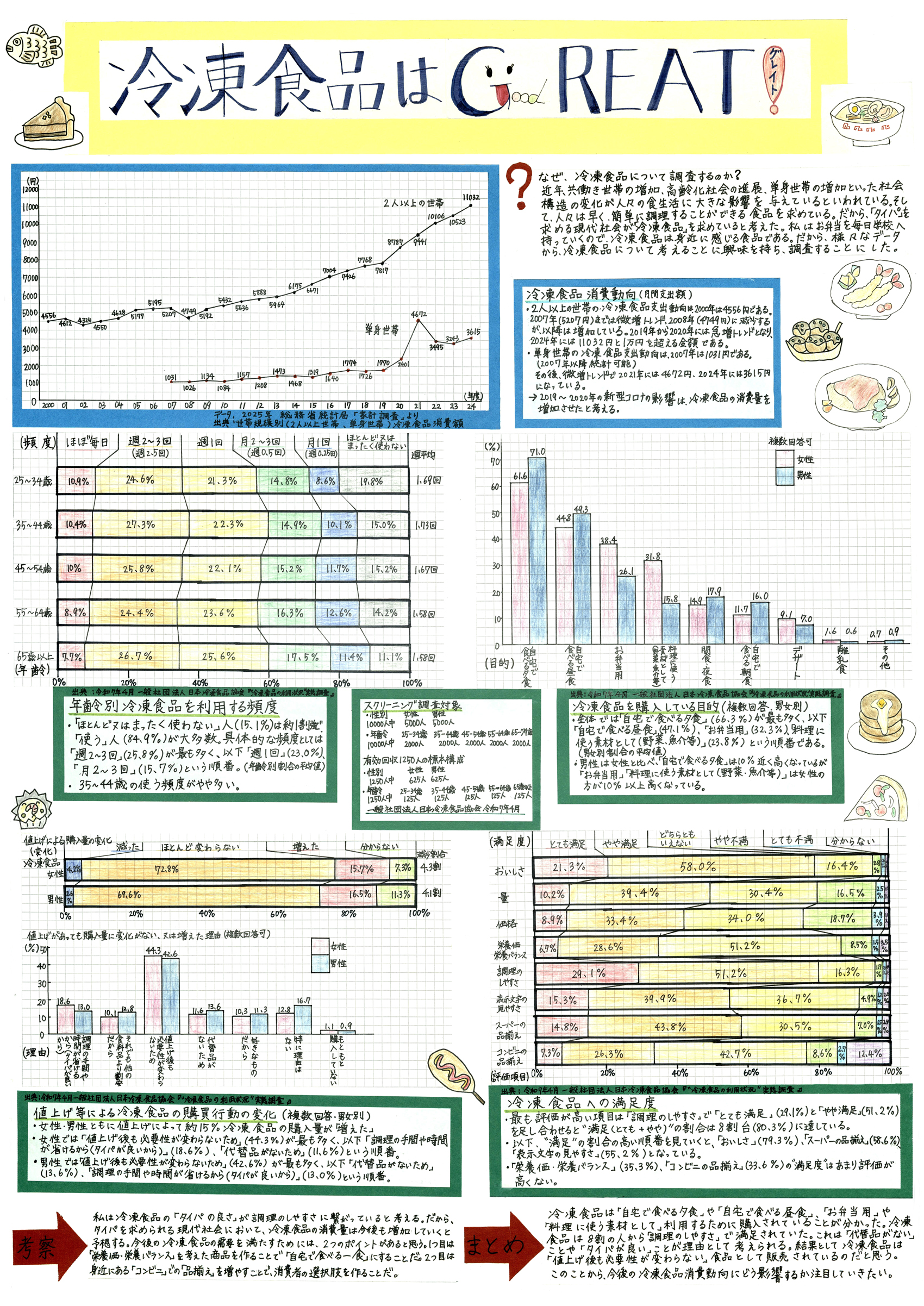 私が冷凍食品を調べた理由は、毎日のお弁当で主食、副菜、デザートなどの様々な種類があり興味深く思ったからです。現代人の生活様式の変化や冷凍食品の利用目的の違いなども読み取ることができて面白かったです。