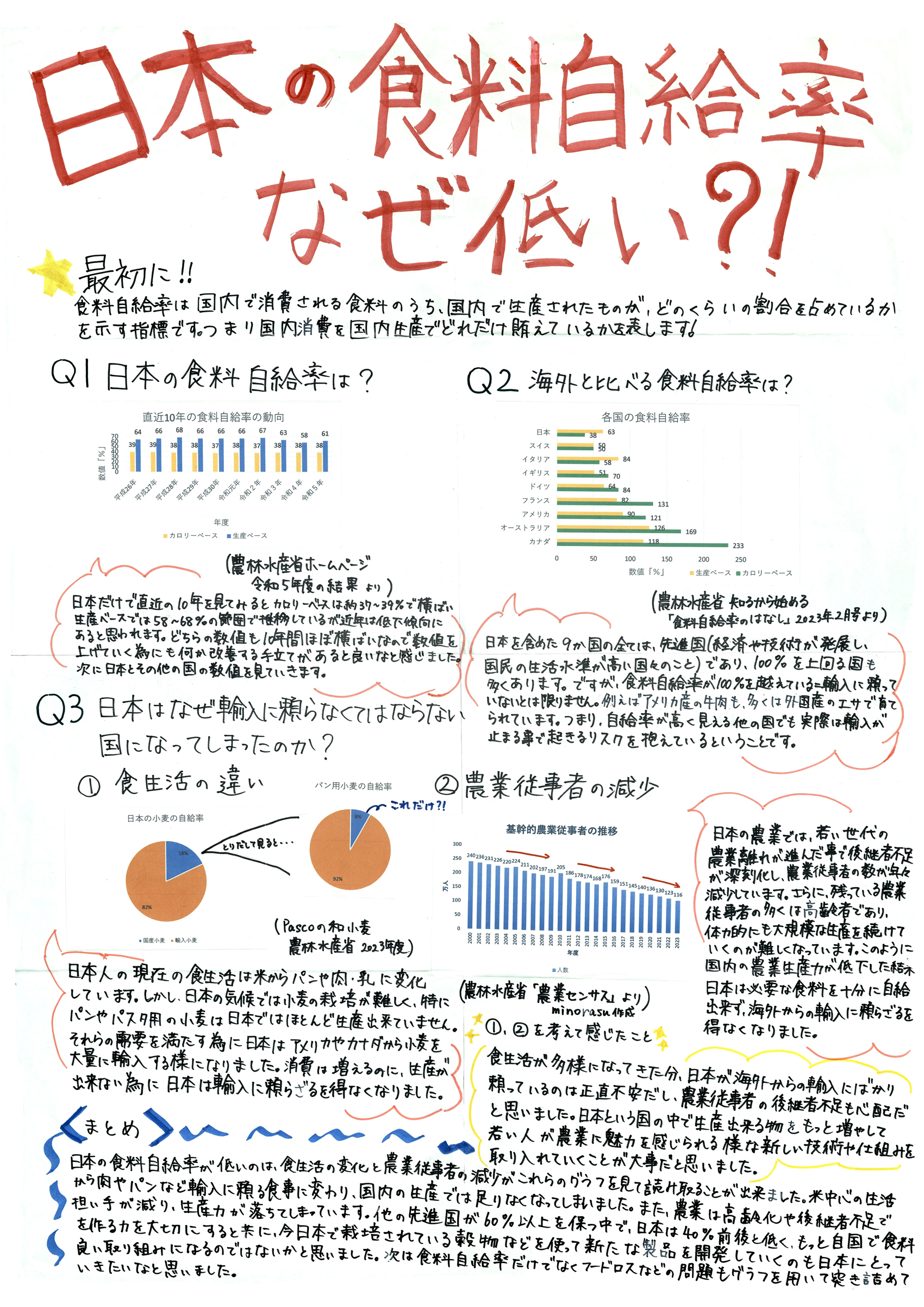 呼吸からCO₂排出量を考える着眼点が面白く、給食を通じて環境への取り組みに気づかされる作品です。地球温暖化と食材の関係をわかりやすく示し、環境に優しい食事の提案も丁寧にまとめられていました。